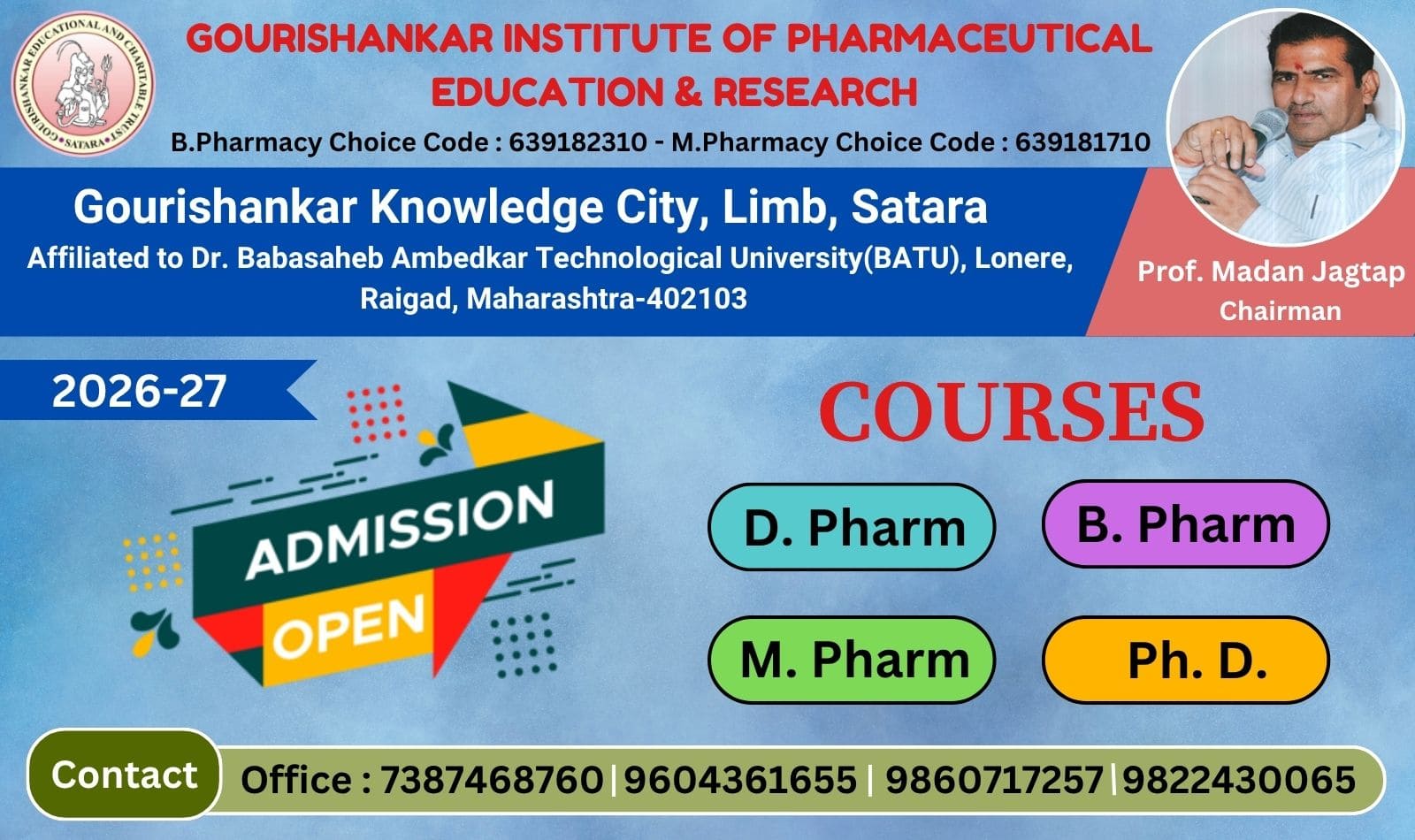 Gourishankar Institute of Pharmaceutical Education & Research (B. Pharm.), Limb, Satara. is started in 2008 by our beloved President Prof. M.S. Jagtap with a great vision of providing quality education in Pharmacy to economically, educationally and socially weaker section of society. Also M. Pharmacy in Pharmaceutics which is a post graduation course is started in 2012. Our Institute is a recognized Ph.D. Research Center since 2012.